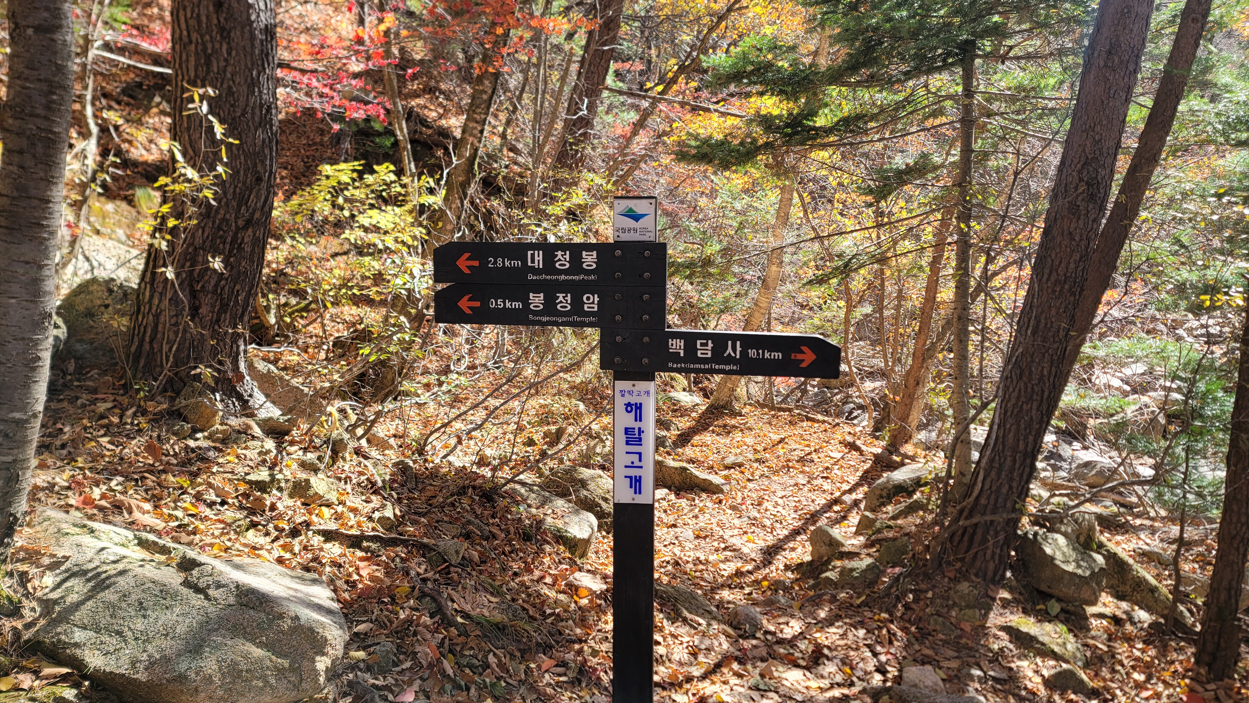 백담사 주차장을 벗어나면서 부터 본격적인 산행이 시작된다. 대청봉코스는 실제 해탈고개라 불리우는 봉정암 500m 전까지는 그리 어려운 코스가 나오지는 않는다. 몇번의 계단이 조금 힘들게 하지만 힘들쯤 나오는 약한 경사길이 한숨을 돌리며 밀땅을 하는 정도이다. 단, 오랜 시간동안 걸어보지 않은 사람들에게는 편도 11Km가 어렵게 다가온다.