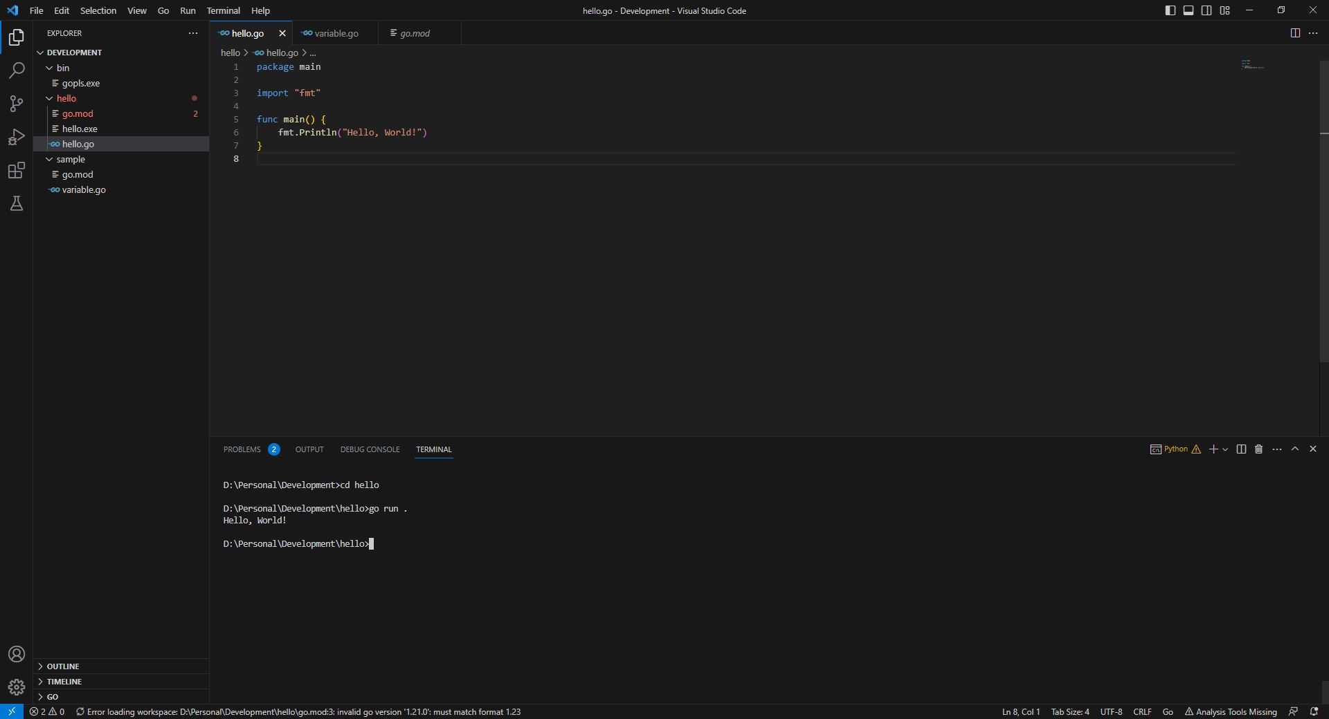 Type Golang's run command in the command prompt, you will see “Hello, World!”